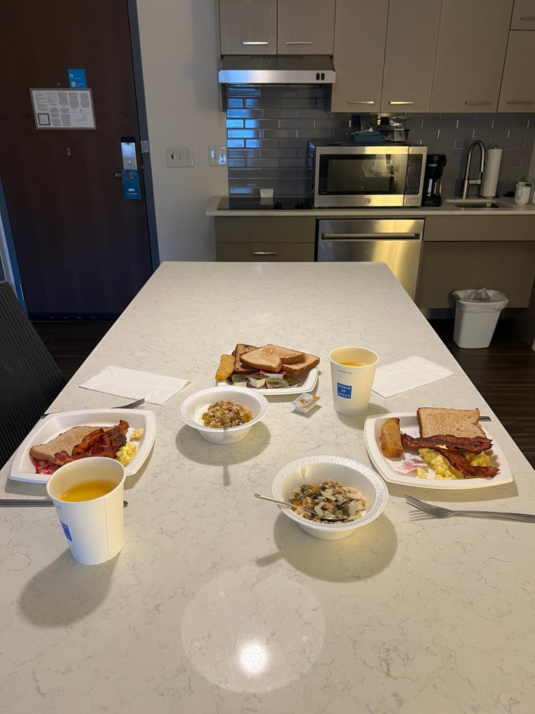 Vanmorgen hebben we het ontbijt op onze kamer. Harry is enkele malen heen en weer gelopen naar het ontbijtbuffet om eten mee te nemen naar de kamer. We zitten nu op de benedenverdieping dus is dat nu goed te doen.
