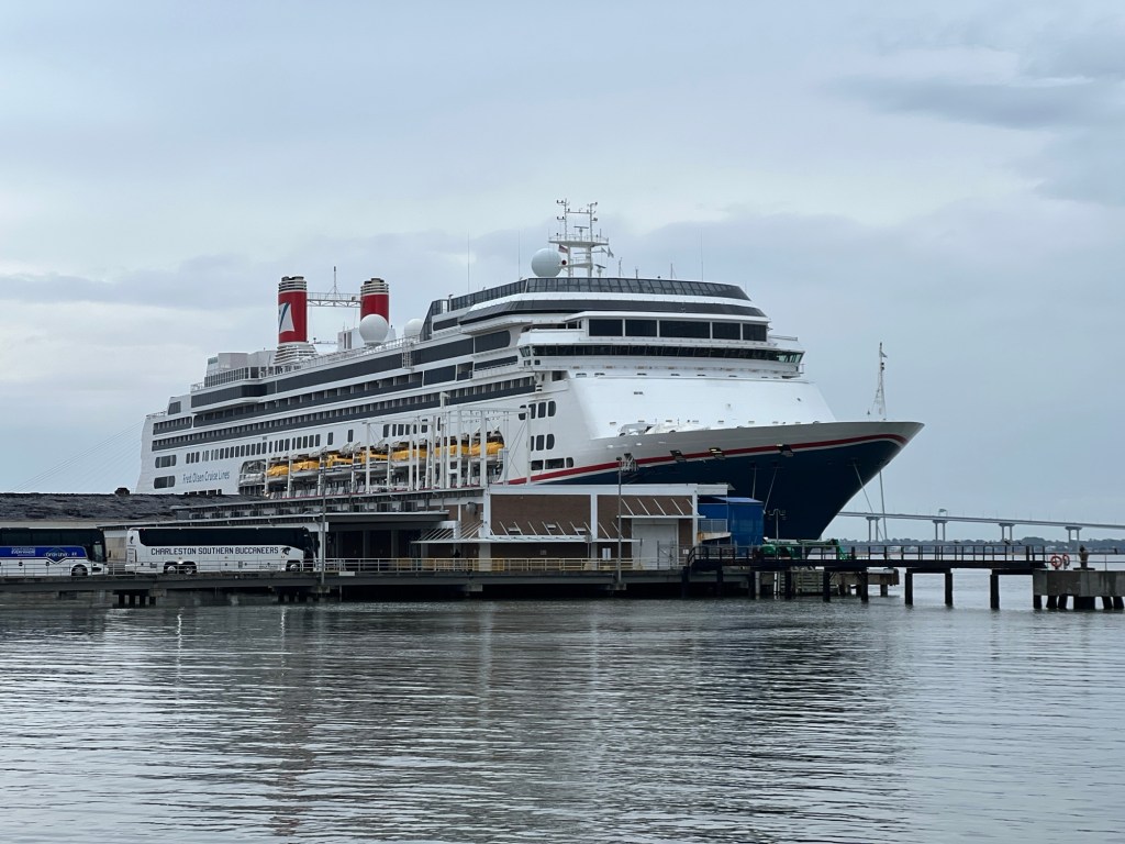 Inmiddels is langs de kade van de Ashley rivier een groot cruiseschip aangemeerd.
