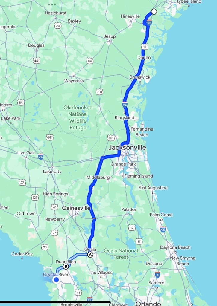 Na een ontbijt in het hotel rijden we om 10.00 uur weg. We gaan terug naar Florida. Een lange rit over de Interstate 95 via de stad Jacksonville. Het is een zonnige start van de dag bij een temperatuur van 10 graden.