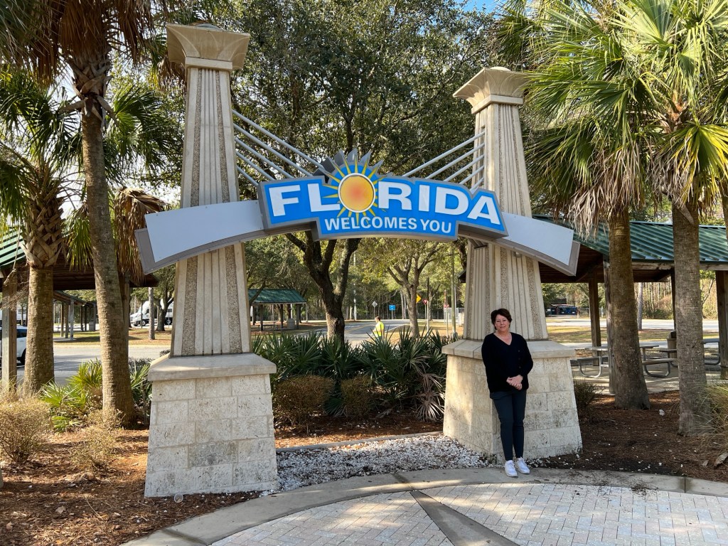 Om 11.10 passeren we de staatsgrens en rijden vanuit de staat Georgia Florida weer in. Even verderop aan de snelweg is een afslag naar het Visitor Center van Florida. We nemen een foto bij het welkomstbord en halen daarna wat folders van Florida in het Visitor Center.