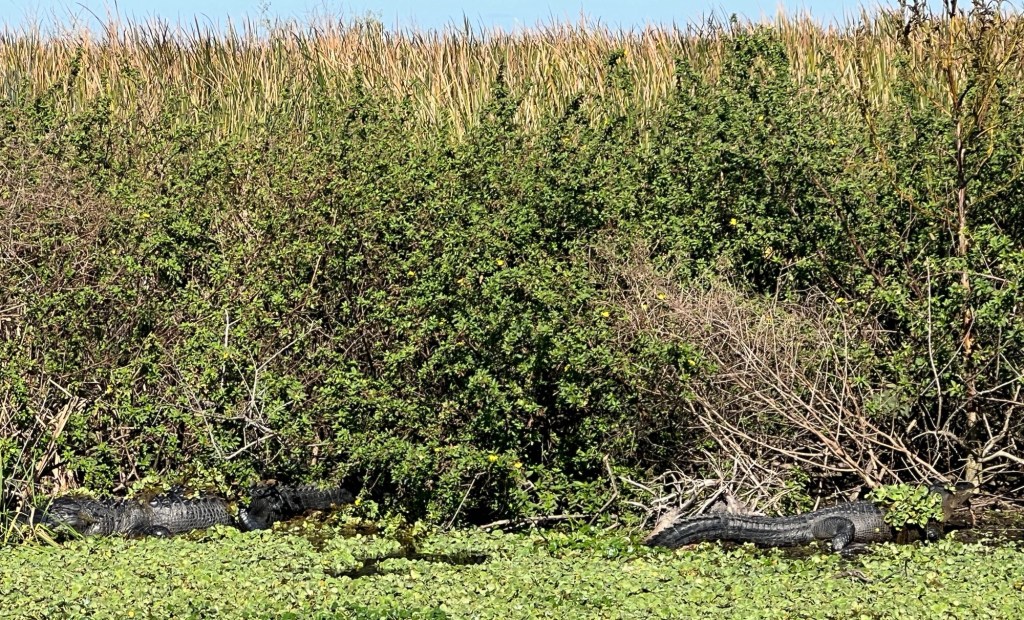 We komen als snel aan de rechterkant van de weg de eerste 2 alligators tegen. Het zullen niet de laatste zijn. Het blijven indrukwekkende dieren. Ze liggen lekker in de zon. Er komt geen beweging in.