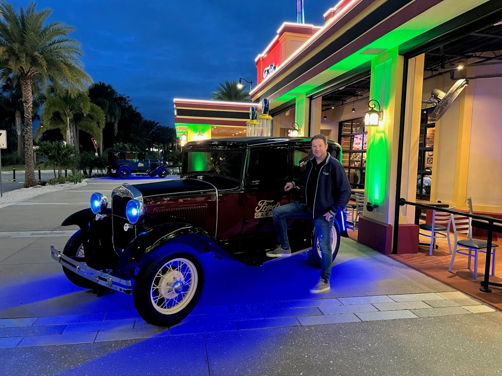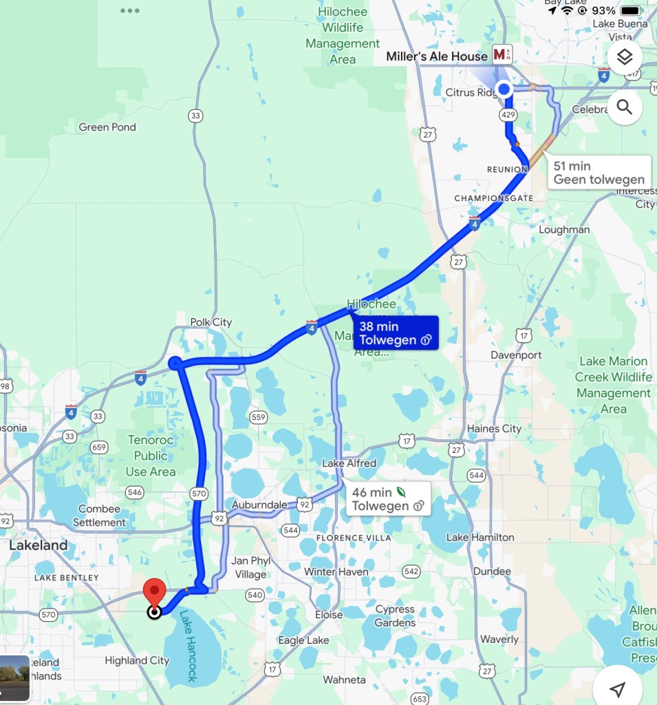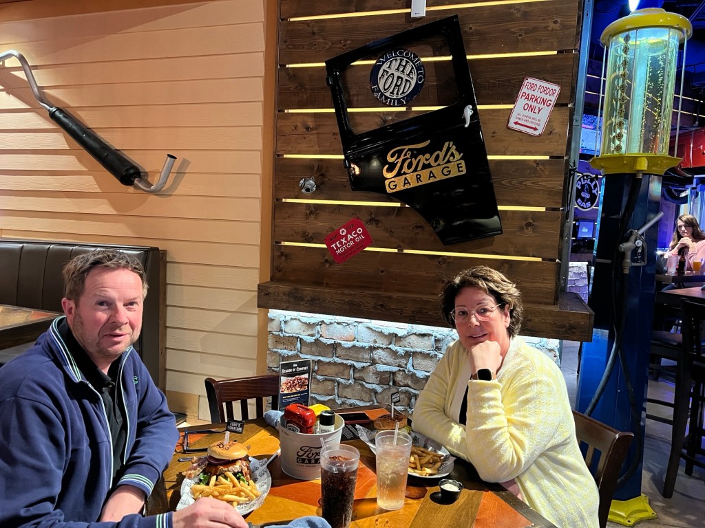 Als we nog een stukje van de Windmill Whisper trail aflopen zien we in de verte 2 otters het pad oversteken. Helaas waren ze ons te snel af om ze op de gevoelige plaat vast te leggen. We lopen weer terug. Als we terug zijn bij de parkeerplaats hebben we 9,5 km gelopen, waar we ruim 3 uur over hebben gedaan. Dit was allemaal wel de moeite waard. Het is al 16.30 uur als we het natuurreservaat verlaten. We rijden dezelfde route terug en gaan eten bij Ford’s Garage Kissimmee aan de Margarita Boulevard. Een bekend restaurant voor ons. In onze vorige Florida reis in 2019 hebben we deze restaurants ook bezocht. In Orlando zitten er nu inmiddels 4.