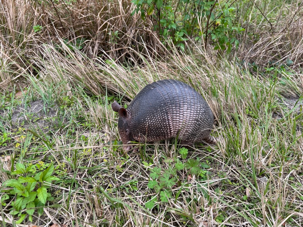 We beginnen met de Sandy Oak trail. We zijn nog maar net op weg of we komen een gordeldier tegen die al snuffelend langs het pad door het gras loopt. Hij is helemaal niet bang.