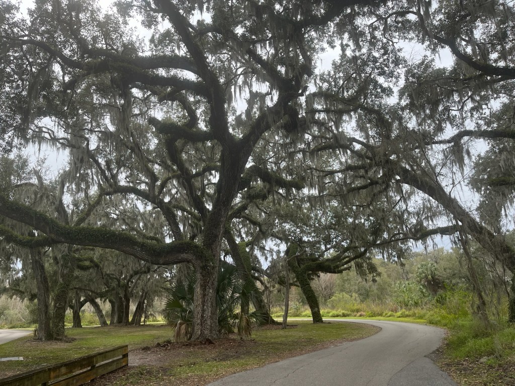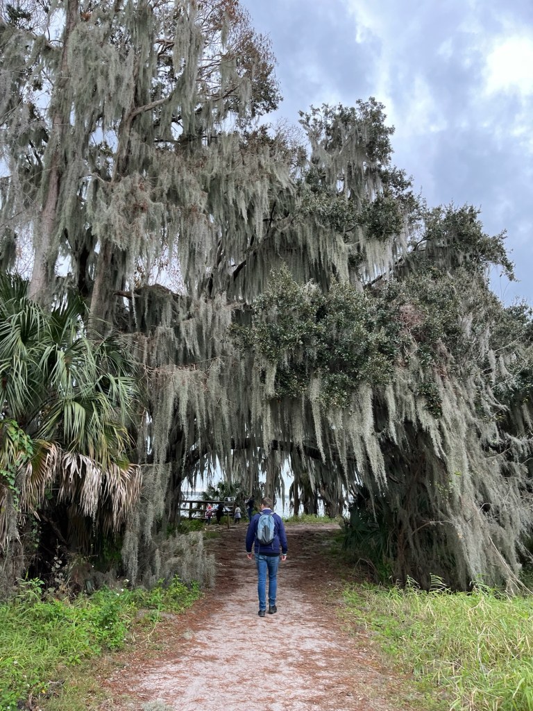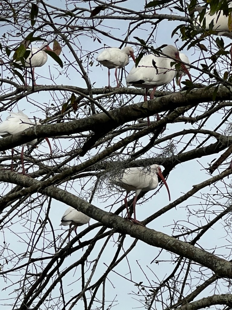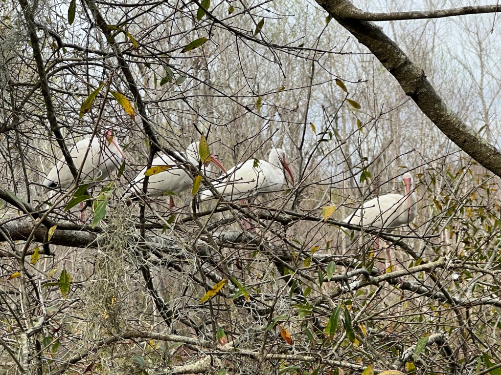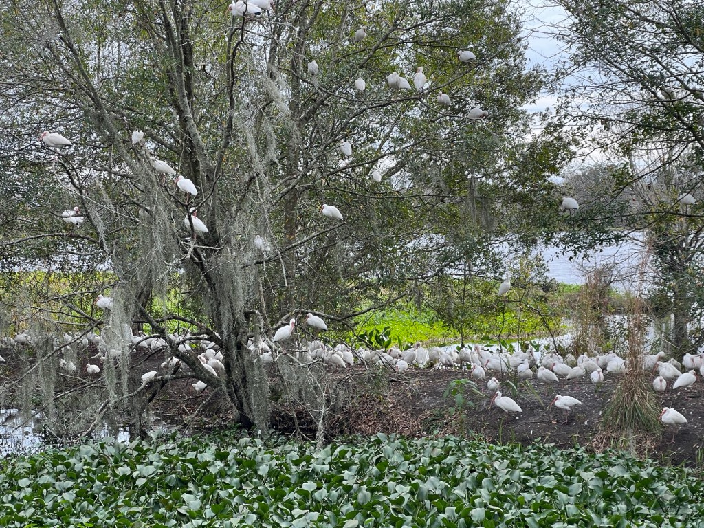 Via de Wading Bird trail gaan we over op de Marsh Rabbit Run trail. Dit is een smal pad met rondom water. Best wel spannend en goed opletten of er niet een alligator verdekt opgesteld ligt. Er staan ook regelmatig waarschuwingsborden over de alligator. Er kan er ook zo maar 1 midden op het looppad liggen. Het dringend advies is om deze alligator niet te passeren maar om te keren. Wij komen op het pad geen alligator tegen. Wat we wel tegenkomen is veel witte ibissen. Met honderden zitten ze langs de kant en in de bomen die begroeid zijn met Spaans Mos.