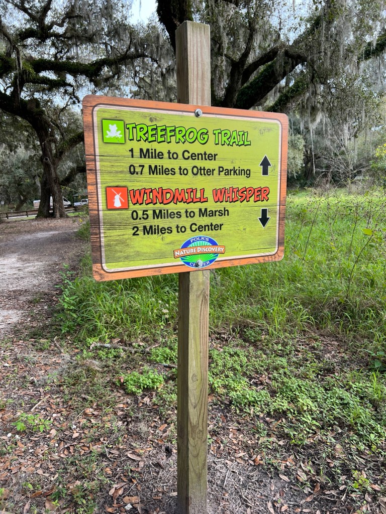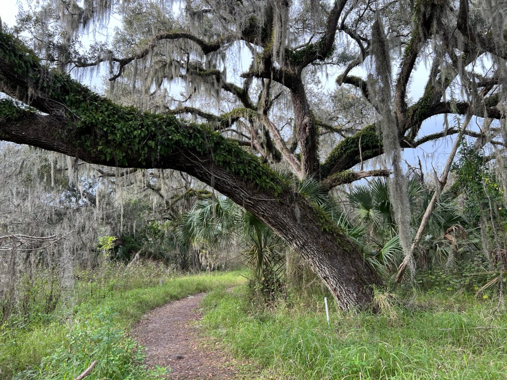 Via de Heron Hideout trail pakken we de Treefrog trail. Deze laatste loopt door een mooi bos. Er staan nog enkele wilde citrusbomen van de voormalige ranch in dit stuk bos.