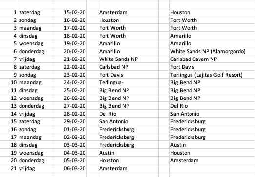 Half februari gaan we weer richting Amerika. Dit maal gaan we een rondje door Texas doen. We beginnen in Houston en rijden dan via o.a. Dallas, Amarillo, Alamorgordo, Carlsbad, Fort Davis, Big Bend National Park, Del Rio, San Antonio, Fredericksburg en Austin weer terug naar Houston. We zijn 20 dagen onderweg. De route is ca. 4000 km of te wel 2500 mile.